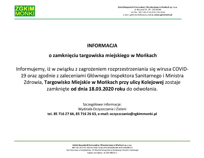 Informujemy, iż w związku z zagrożeniem rozprzestrzeniania się wirusa COVID-19 oraz zgodnie z zaleceniami Głównego Inspektora Sanitarnego i Ministra Zdrowia, Targowisko Miejskie w Mońkach przy ulicy Kolejowej zostaje zamknięte od dnia 18.03.2020 roku do odwołania.