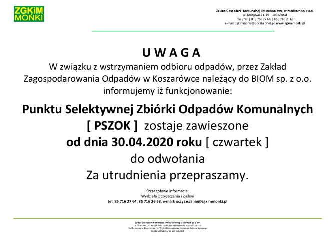W związku z okresowym wstrzymaniem przez Zakład Zagospodarowania Odpadów w Koszarówce, należący do BIOM sp. z o.o. odbioru odpadów przekazywanych do PSZOK-u, informujemy iż od dnia 30 kwietnia 2020 roku [ czwartek ] do odwołania zostaje wstrzymane funkcjonowanie Punktu Selektywnej Zbiórki Odpadów Komunalnych.